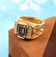 #0-45W. SHIMRAJEWELS բրենդի տղամարդու մատանի 925 հարգի ստերլինգ արծաթից, պատված 18 կարատ ոսկով: Գլխավոր քարը բնական ծխագույն քվարց, կողքի քարերը արհեստական ցիրկոն ադամանդի իմիտացիայով: Ձեռքի աշխատանք